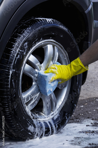 carwash, car, laundered, washing, wheel, cleaning, sponge, hand, yellow, glove, service, maintenance, soap, water, foam, polishing, machine, arm, restore, surface, silver, turquoise, colours, lacquer, paint, hard, work, repair, blue, wisp, human, closeup, bathe, man, person, outdoors, transportation, vehicle, colours, bubble, brightly, clean, shampoo, simple, rubbing, rubber, tire, tread