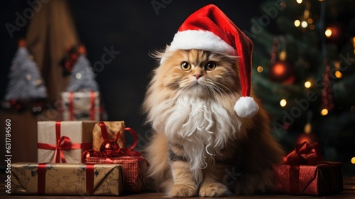 The cat is dressed like Santa Claus and wears red Santa hats. The Christmas tree and gifts can be seen in the background