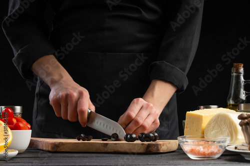 The chef cuts Italian masks to prepare a delicious and fresh salad. Vegetarian and fresh food, gastronomy and cooking, a recipe book and recipes for home cooking