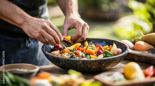 The chef is preparing a fruit salad with kiwis, strawberries, and oranges
