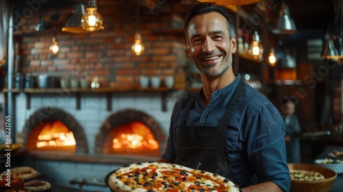 food, professional, smiling, happy, kitchen, chef, eatery, pizza, casual attire, interior, fresh, cooking, pizzeria, apron, dining, meal, rustic, culinary, brick, hand-made, hot, cookery, traditional, enjoyment, ingredient, preparation, delicious, oven, italian, epicure, hospitality, receipe, artisan, catering, tasty, skill, taste, specialist, baked, authentic, mouth-watering