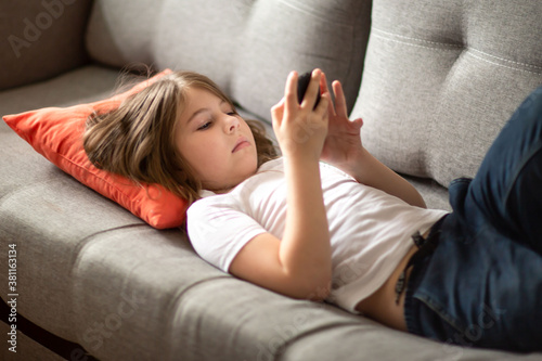 the child lies on the couch and looks at the phone