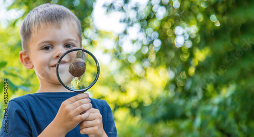 The child looks at the snail nature. Selective focus.