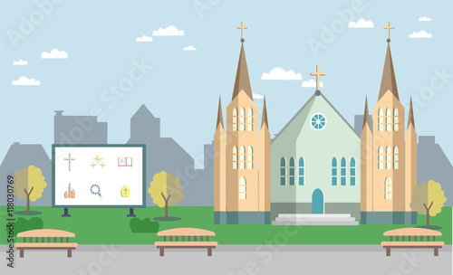 The church on the background of the city. Icons with Catholic symbols. Vector illustration.