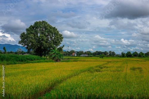 The close background of the green rice fields, the seedlings that are growing, are seen in rural areas as the main occupation of rice farmers who grow rice for sale or living.