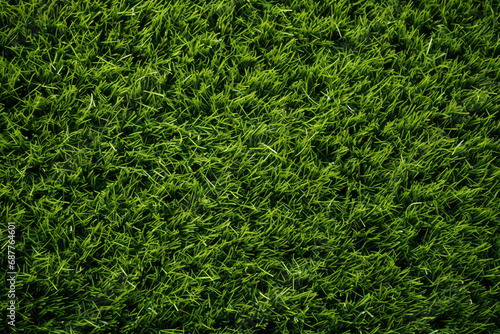 The close up landscape detail of lush green grass meadow or artificial grass in a football field texture surface, background and wallpaper. Generative AI.