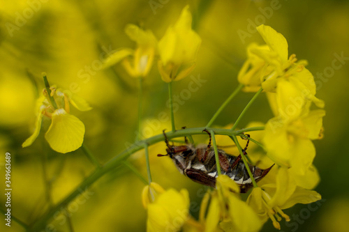 The cockchafer called also May bug or doodlebug is beetle from family Scarabaeidae genus Melolontha. Eats buds of oilseed rape (canola) plants.