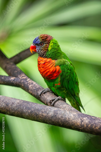 The coconut lorikeets (Trichoglossus haematodus) is a parrot in the family Psittaculidae. The bill is orange-red, and the head dark blue fading to brown at the neck.