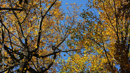 autumn, tree, fall, sky, nature, leaf, leaf, red, yellow, blue, forest, season, tree, orange, tree branch, maple, colours, landscape, bright, park, plant, day, botany, colourful, nobody, sunny, charming, america, background, quiet, tranquil, sunlight, life, garden