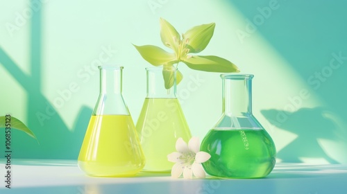 laboratory, science, flask, beaker, chemistry, green, yellow, plant, nature, glassware, organic, bio, experiment, research, floral, background, bright, studio, workspace, fresh, vibrant, liquid, serenity, environment, environmentally friendly, study, educational, aesthetic, minimalism