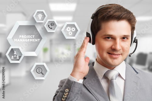 The concept of business, technology, the Internet and the network. A young entrepreneur working on a virtual screen of the future and sees the inscription: Project management