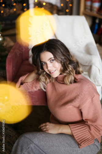 The concept of Christmas home shooting. Beautiful attractive cute brunette girl with short hair in warm home clothes sitting on a chair near the Christmas tree on the background of the fireplace..