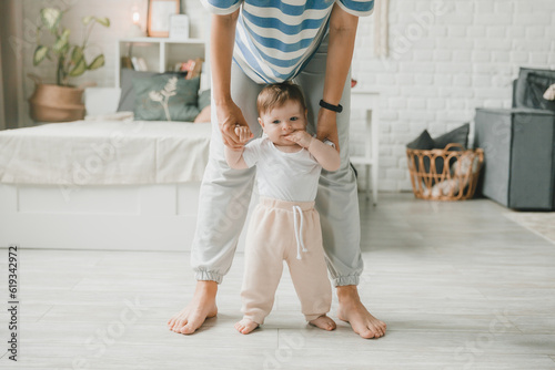 the concept of family, child, childhood, happy little child learns to walk with the help of mother at home