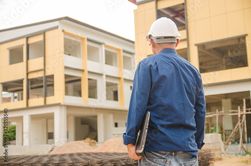 The construction engineer stood and looked at the building at the construction site.