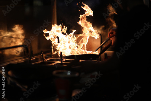 kitchen, food, fire, flames, frying pan, oil, fat, fuel, darkness, cook, receipe, water, quench, crane, indoor, accident, hand, man, burn, orange, background, smoke, gleam, wok, dish, utensil