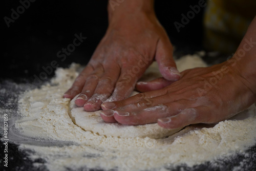 The cooking process of a bread dough. Baking bread recipe. Bakery breads food, detail view with woman hands working on dough at an old wood pan. flour falling on a dark table. detail.
