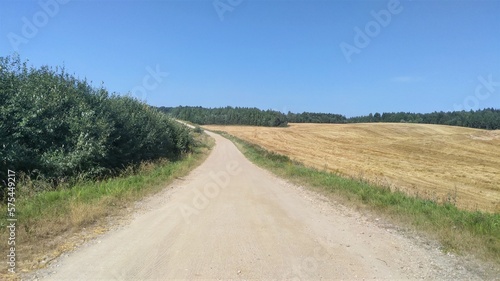 The country road runs along the shrubbery and a harvested field, behind which a mixed forest grows. Grass grows on the sides of the road. It is dusty. Sunny and clear blue skies
