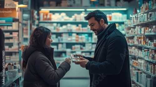 couple, pharmacy, shopping, medicine, product, health, interaction, retail, consumer, wellness, lifestyle, communication, store, conversation, young, adult, modern, shelf, apothecary, assistance, friends, support, cosy, medicine, consultation, urban, human relationships, casual attire, indoor, bright