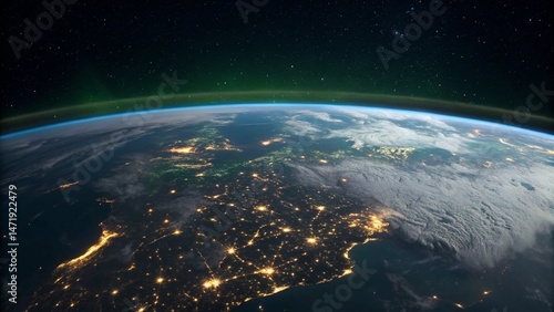 The curved horizon of Earth glows with a brilliant green aurora, as the intricate network of city lights below illuminates the continent, offering a mesmerizing perspective on natural wonders
