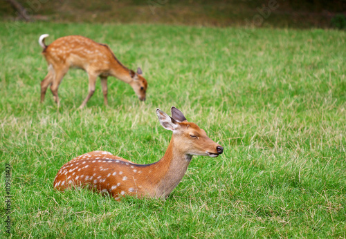 The cute brown roe deers relax in the green grass