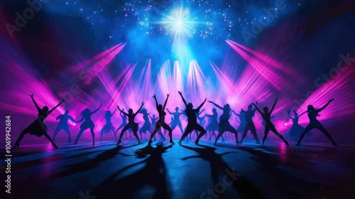 dance, performance, light, silhouette, stage, music, celebration, entertainment, colours, festival, night, party, energy, art, motion, excitement, people, rythm, creativity, fun, show, artistic, modern, vibrant, atmosphere, crowd, beauty, oneness, expression, dynamic, lively