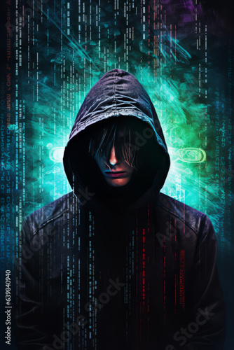 The dark web hooded hacker, digital binary code