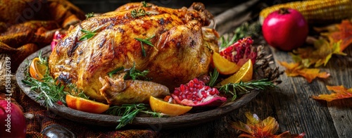 The delicious roasted turkey garnished with vibrant autumn fruits and herbs