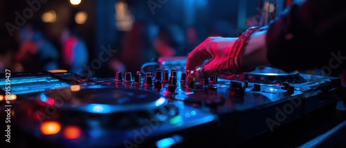 dj, controller, mixer, turntable, music, nightlife, nightclub, party, sound, audio, performance, concert, club, light, colourful, vibrant, hand, finger, technology, equipment, entertainment, mixing, beat, bass, electronic, dance, crowd, blurred, bokeh, stage, professional, operator, gear, console, knob, buttons, setup, closeup, banner