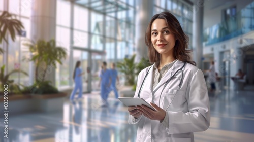 technology, woman, portrait, doctor, medicals, health care, people, modern, smiling, work, teamwork, architecture, nurse, hospital, professional, health, building, plant, uniform, confident, patient, indoor, stethoscope, medicine, care, clinic, physician, friendly, staff, light, day, trust, clipboard, consultation, practice, treatment, surgery, specialist, expertise, diagnosis, occupational, atmosphere, facility, surrounding