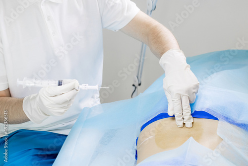 The doctor is about to inject a blockade in the back. The introduction of anesthesia in the back before childbirth. Medical preparation of the patient before injection