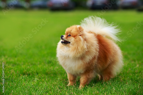 pomeranian, spitz, dog, puppy, orange, breed, pet, ginger, animal, green, grass, smile, tongue, popular, walking, racked, hair, long, fluffy, wool, outdoors, 1, cute, canino, purebred, mammal, solitude, looking, nature, fun, pampered, friendship, playing