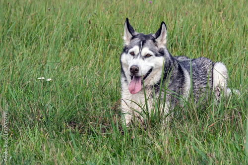 the dog is an Alaskan malamute, a portrait, lies on a high green grass, a dirty face, the nose is soiled in the ground, a dirty tongue is seen, a mouse is hunting in the field,
