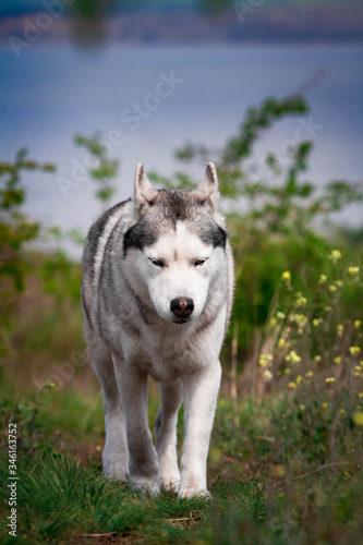 The dog is walking along the grass. Dangerous hunter. Siberian Husky is running.