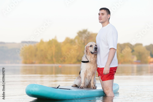 The dog sits on the paddleboard with the owner. A man and a golden retriever float down the river at dawn.