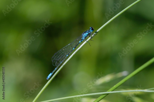 The dragonfly near the water at summer morning light