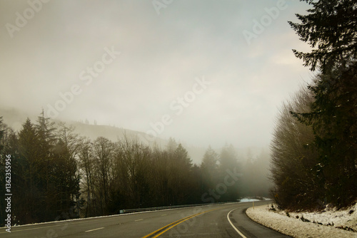 direction, escape, journey, no people, cold, us, tree, road, winding road, highway, highway, hill, timberland, forest, sky, cloud, fog, landscape, outdoors, winter, nature, transportation