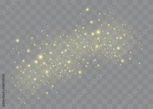 The dust sparks and golden stars shine with special light. Vector sparkles on a transparent background. Christmas light effect.