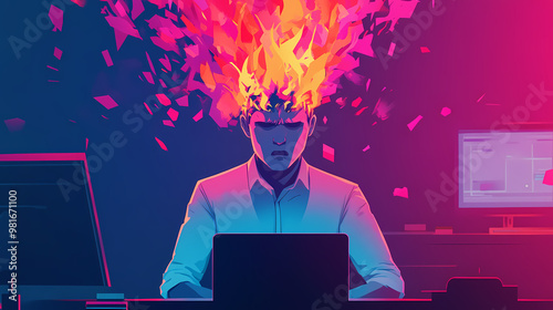 employee, large, company, angry, burn, work, computer, generative, ai, tense, illustration
