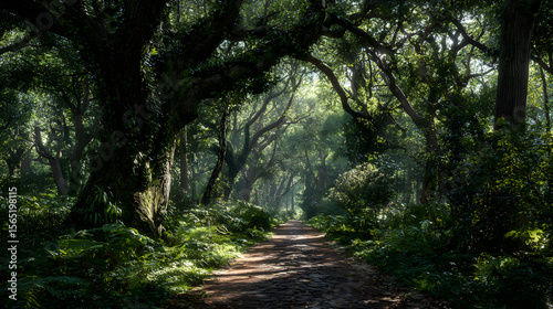 pathway, forest, tree, sunlight, nature, journey, calmness, serenity, foliage, lush, dense, canopy, emerald, aethereal, ancient, whisper, footstep, verdant, labyrinth, echo, time, solitude, scent, contemplation, meditation, wilderness, majestic, earthy, pattern, archway, timeless, traveler, scenic, mystical