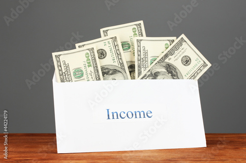 The envelope with the money bills on grey background. Income.