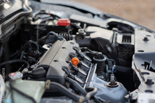 The environmentally friendly motor of a modern car is under the bonnet close-up.