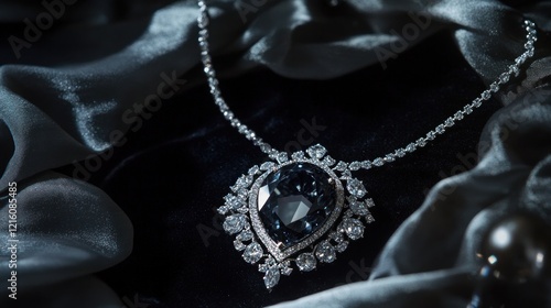 diamond, necklace, jewellery, blue, gemstone, precious, luxury, elegant, beautiful, sparkling, brilliant, dazzling, glamourous, radiant, shimmering, lustrous, glimmering, expensive, valuable, opulent, dark, black, silver, metal, chain, pendant, fashion, style, design, craftsmanship, masterpiece, ornate, adornment, accessory, treasure, rich, dark blue, rare, unique