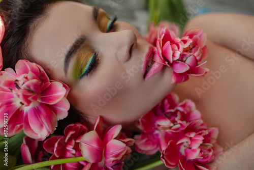 The face of beautiful woman with colorful make-up and flowers . The attractive woman lies in tulips.