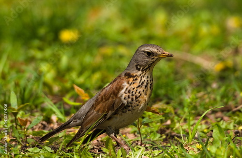 The fieldfare (Turdus pilaris) on the grass. Close-up on fieldfare in the park.