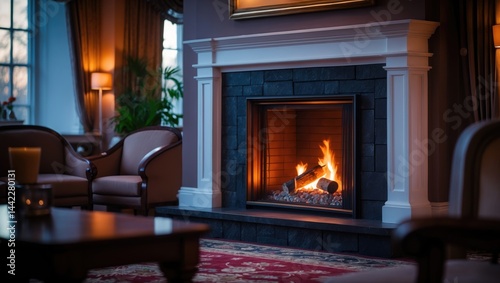 The fireplace is designed with white trimmings to enhance its contemporary feel.