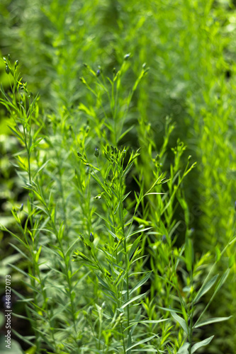 The flax (linseed) plant grows in the garden, a useful plant. Immature small boxes with flax seeds (Linum usitatissimum)