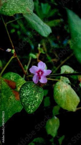 The flower is centrally positioned and has five petals that are a soft lavender or purplish-pink color. The center of the flower has a deeper, reddish-pink hue, providing a good focal