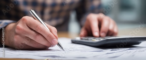 The focused individual writing on paperwork while using a calculator for financial analysis.