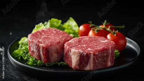 meat, steak, food, epicure, beef, fresh, tomatoes, lettuce, culinary, plate, raw, organic, high-quality, nutrient, dinner, cooking, ingredient, healthy, eatery, butcher, grill, favor, nourishment, receipe, preparation, juicy, protein, dish, indulgence, nature, rustic