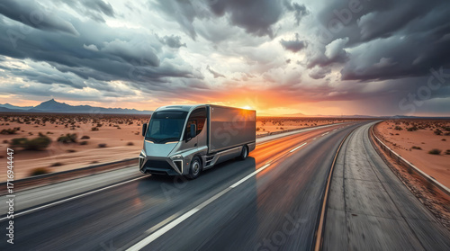 The future of logistics and mobility, an autonomous electric vehicle on a smart highway representing efficiency and innovation in transport.